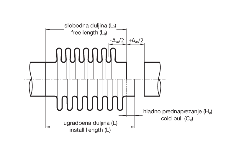 Aksijalni kompenzator mora biti hladno prednapregnut suprotno od smjera radnog produljenja cijevi i instaliran u hladnom stanju. Veličina hladnog prednaprezanja ovisi o temperaturi instaliranja.
