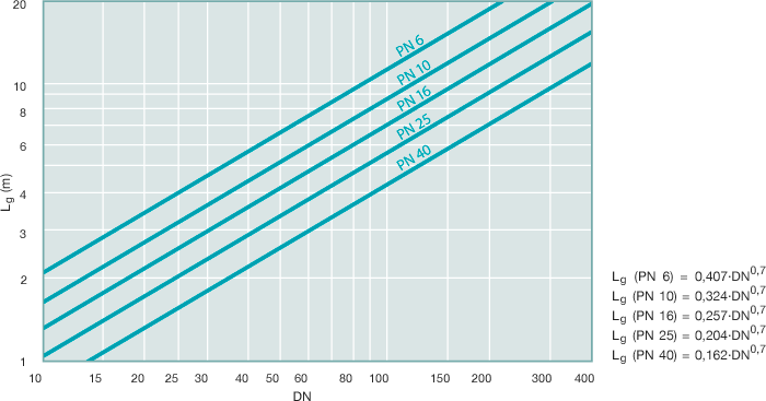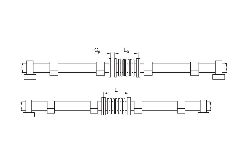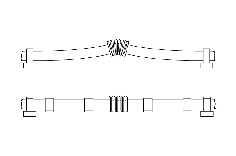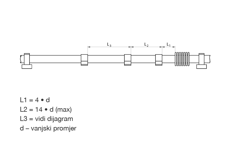 Opća je preporuka staviti aksijalni kompenzator blizu čvrste točke. Prva vodilica treba biti udaljena četiri promjera cijevi od kompenzatora. Razmak između prve i druge vodilice treba biti 14 promjera cijevi. Maksimalna udaljenost ostalih vodilica može se iščitati iz priloženog dijagrama.